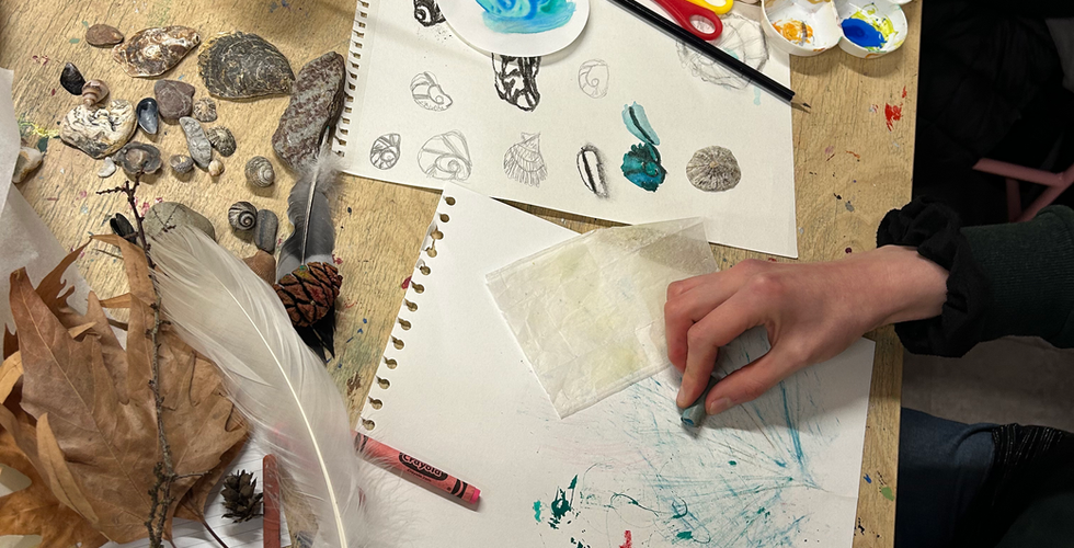 Exploring the world through new eyes: collecting, rubbings, doodling in mixed media. Noticing reflections, shadows, nature.